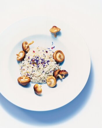 Gewürz-Blüten-Öl-Mischung und Parmesan in das Risotto einrühren, abschließend mit etwas Gewürz-Blüten-Zubereitung bestreuen und servieren.