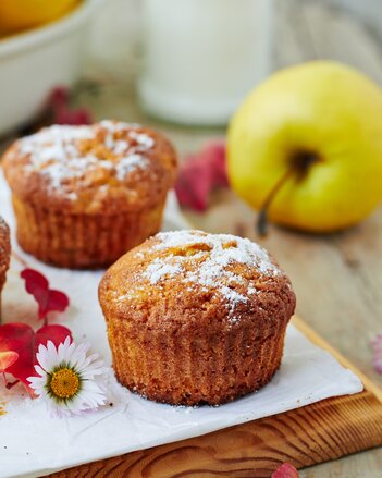 Auf dem Foto sieht man zwei Muffins. Daneben liegt ein Gänseblümchen und dahinter ist ein Apfel zu sehen. | © SONNENTOR