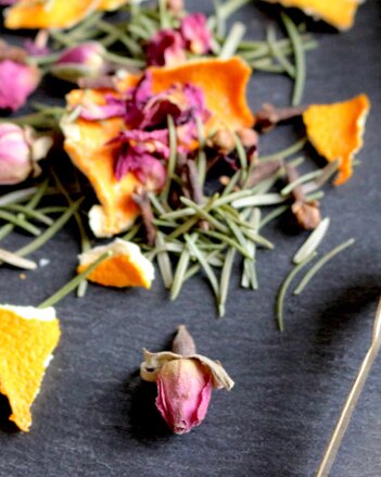 1. Rosenblüten und Nadeln etwas im Mörser zerkleinern und Orangenschale in kleine Stücke brechen oder ebenfalls im Mörser zerkleinern. Alles gut vermischen und in ein verschließbares Gefäß füllen.
