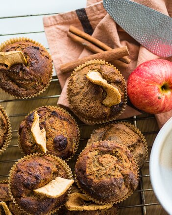 Auf dem Foto sieht man mehrere Muffins. Neben den Muffins sind auch ein Apfel und Zimtstangen zu sehen. | © SONNENTOR