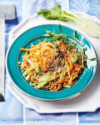 Dinkelreis laut Packungsanleitung kochen. Karotten, Fenchel und Stangensellerie in lange dünne Stifte schneiden, in Olivenöl und frisch geriebenem Ingwer zugedeckt anrösten.