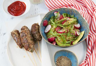 Auf dem Foto sind Spieße mit Cevapcici zu sehen. Daneben sieht man eine Schüssel mit Salat.  | © SONNENTOR